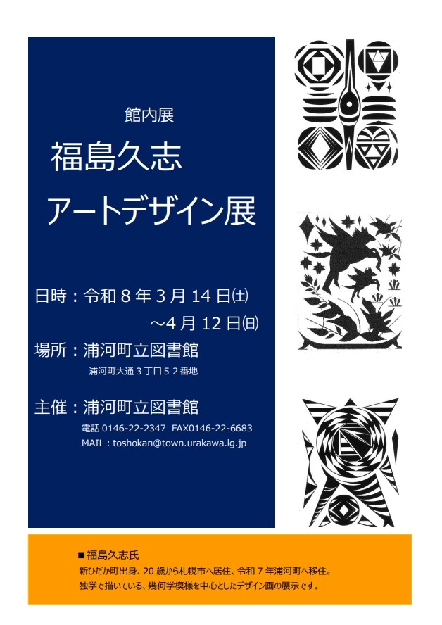 記事を探す ホーム 記事を探す 【~4月12日(日)】福島久志 アートデザイン展 開催中! 2026年3月23日 浦河町 イベント お知らせ 【~4月12日(日)】福島久志 アートデザイン展 開催中! 3月14日(土)から浦河町立図書館にて、幾何学模様を中心としたデザイン画を 数多く描いている福島久志氏のアートデザイン展が開催されています! ぜひ、この機会に図書館へ遊びに行きませんか! 開催日時令和8年3月14日(土)~4月12日(日)場所浦河町立図書館(浦河町大通3丁目52番地)お問い合わせ先浦河町立図書館TEL:0146-22-2347 最近の投稿 【~4月12日(日)】福島久志 アートデザイン展 開催中! 【3月29日(日)】インド風春祭り「バサントウッサブ」開催! 終了しました)【3月18日(水)~19日(木)】平取町 日高町 観光物産展 開催中!! 【5月2日(土)】ゴールデンウィーク特別企画!~電動マウンテンバイクに乗って様似ダムへ釣りに行こう!~ 【3月10日(火)】ウポポイ展示イベント「森を生かす、アイヌ文化継承のいまVol.2~北海道平取町~」開催! アーカイブ 2026年3月 2026年2月 2026年1月 2025年12月 2025年11月 2025年10月 2025年9月 2025年8月 2025年7月 2025年6月 2025年5月 2025年4月 2025年3月 2025年2月 2025年1月 2024年12月 2024年11月 2024年10月 2024年9月 2024年8月 2024年7月 2024年6月 2024年5月 2024年4月 2024年3月 2024年2月 2024年1月 2023年12月 2023年11月 2023年10月 2023年9月 2023年8月 2023年7月 2023年6月 2023年5月 2023年4月 2023年3月 2020年12月