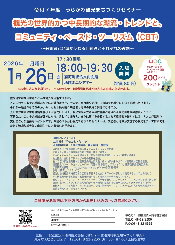 記事を探す ホーム 記事を探す 2025年度 浦河観光協会 観光まちおこし・ひとづくりワーキンググループ 2025年10月24日 浦河町 イベント お知らせ 体験 2025年度 浦河観光協会 観光まちおこし・ひとづくりワーキンググループ 浦河町にて「町内における観光地づくりの理解を深め、仲間を増やす」為の勉強会、「観光まちおこし・ ひとづくりワーキンググループ」が浦河観光協会主催で開催されます! 浦河町在住で興味がある方は、申込フォームまたは電話にて浦河観光協会までお申し込みください! 申込方法参加申込フォームまたは電話にてお問い合わせ先一般社団法人浦河観光協会TEL:0146-22-3200 最近の投稿 【1月31日(土)】日高国際スキー場 味の市フェスティバル 開催!! 雪花青(ショコラ菓子)の新ひだか町限定パッケージが登場!! 【1月24日(土)】TV番組『LOVE HOKKAIDO』にて、ひだかの魅力を放送予定!! 浦河町スケートリンク 営業開始! 終了しました)【1月10日(土)開催】ニューイヤーフェスティバル in とみくる ~日高地域の絆・伝統文化を輝く未来へ~ アーカイブ 2026年1月 2025年12月 2025年11月 2025年10月 2025年9月 2025年8月 2025年7月 2025年6月 2025年5月 2025年4月 2025年3月 2025年2月 2025年1月 2024年12月 2024年11月 2024年10月 2024年9月 2024年8月 2024年7月 2024年6月 2024年5月 2024年4月 2024年3月 2024年2月 2024年1月 2023年12月 2023年11月 2023年10月 2023年9月 2023年8月 2023年7月 2023年6月 2023年5月 2023年4月 2023年3月 2020年12月