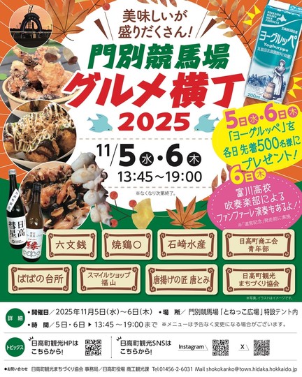 門別競馬場にて、日高町内外の飲食事業者が集まるグルメイベントが開催されます! 6日(水)は富川高校吹奏楽部によるファンファーレ演奏も実施されますので、 ぜひこの機会に門別競馬場へ足を運んで見てはいかがでしょうか!