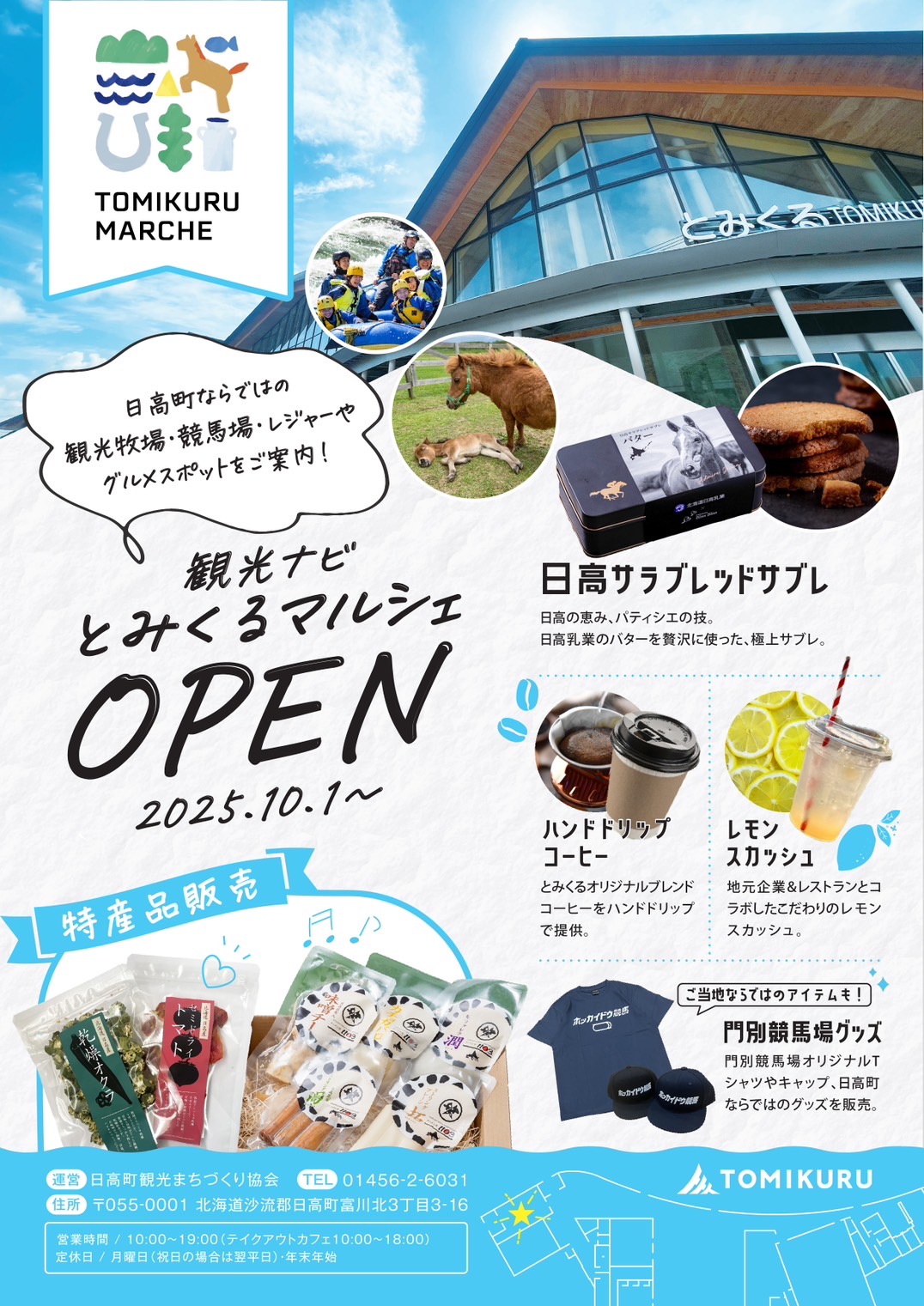 世代やグループを超えた交流・新たなコミュニティの創出、観光情報の発信の拠点、バスターミナルを 中心とした交通拠点としての施設です。 施設内には日高町の特産品やグッズを販売する『とみかわマルシェ』があり、日高町ならではの観光 牧場・競馬場・レジャーやグルメスポットを案内する他、ハンドドリップで提供する『とみくるオリ ジナルブレンドコーヒー』や地元企業&レストランとコラボしたこだわりの『レモンスカッシュ』も 楽しむことができます。